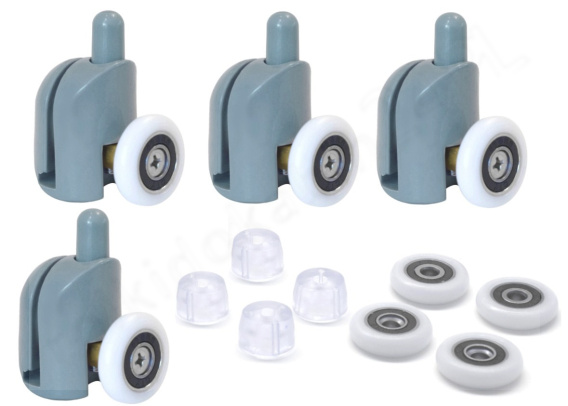 Uniwersalny zestaw naprawczy do kabiny prysznicowej składający się z 4 rolek dolnych pojedynczych D04-1 oraz kompletu 4 odbojników i zapasowych kółek z metalowym łożyskiem o śr. 23mm. Uniwersalna rolka D04-1 pasuje do większości kabin dostępnych na polskim rynku, dzięki wykorzystaniu wysokiej jakości materiałów o podwyższonej odporności m. in. na korozję oraz kamień wapienny doskonale nadaje się do użytku w każdych warunkach. Rolka posiada ruchomy element wypinający, dzięki czemu doskonale dopasowuje się do toru jezdnego kabiny oraz zapewnia szybki demontaż drzwi bez konieczności użycia dodatkowych narzędzi.